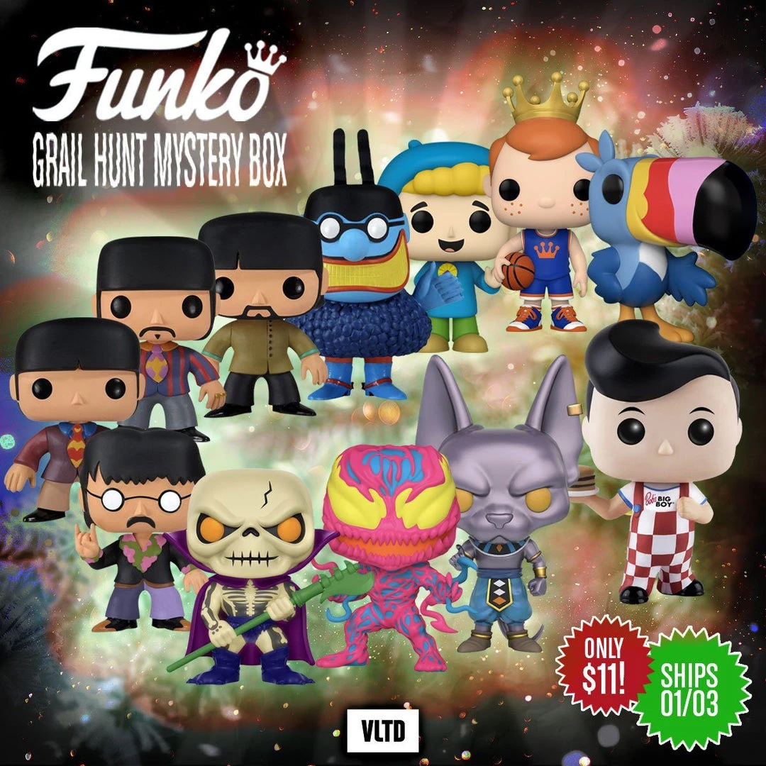 VLTD’s End of the Year Mystery Box is here and we are proud to present our widest assortment of hits and exclusives ever – with an even lower price point of $11 per box! Grand prizes for this mystery box are SDCC 2016 Big Boy LE480, Scare Glow SDCC Shared Exclusive, Black Light Carnage Funko Shop Exclusive, Metallic Beerus SDCC 2016 Exclusive, Toucan Sam Funko Shop Exclusive, 5 Vaulted Beatles Yellow Submarine Pops, and more!